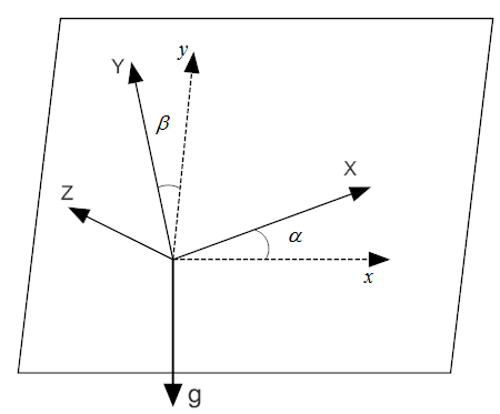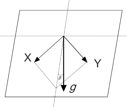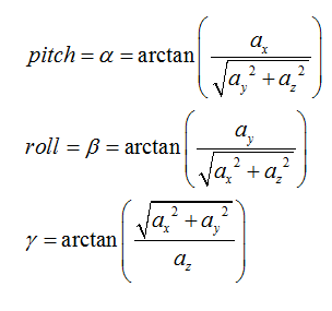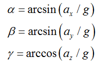 假設(shè)傳感器的X軸與水平面xy之間的夾角為α(稱(chēng)為俯仰角,pitch),Y軸與水平面間的夾角為β(稱(chēng)為滾轉(zhuǎn)角,roll),Z軸與重力方向夾角為γ。