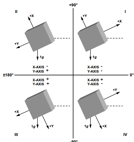 如下圖所示,加速度傳感器在X-Y平面內(nèi)旋轉(zhuǎn),由于X軸與Y軸正交,X軸檢測(cè)到重力加速度的正弦分量,Y軸檢測(cè)到重力加速度的余弦分量。旋轉(zhuǎn)時(shí)隨著一條軸的靈敏度下降,另一條軸的靈敏度將會(huì)上升。