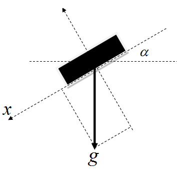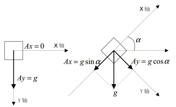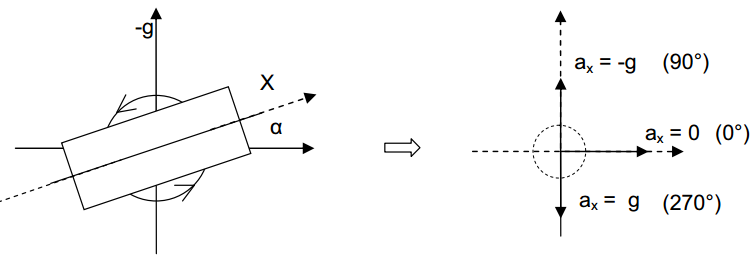 如下圖所示,假設(shè)X軸上測(cè)到的加速度值為ax,則傾角α的值為:α = arcsin(ax/g). 如果傾角只在很小的范圍內(nèi)變化,則可以使用近似公式sinα≈α,于是α ≈ k·(ax/g),比例系數(shù)k用于傾角的線(xiàn)性近似計(jì)算。