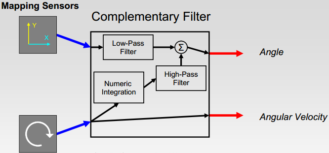 以?xún)奢喥胶庑≤?chē)(倒立擺模型)為例,當(dāng)檢測(cè)到傾角存在時(shí)要控制小車(chē)以一定的加速度運(yùn)動(dòng),才能維持平衡而不至于倒下。因此傾角的測(cè)量成為控制小車(chē)直立的關(guān)鍵。而在實(shí)際小車(chē)運(yùn)動(dòng)過(guò)程中,由于小車(chē)本身的運(yùn)動(dòng)所產(chǎn)生的加速度會(huì)產(chǎn)生很大的干擾信號(hào)疊加在上述測(cè)量信號(hào)上,使得輸出信號(hào)無(wú)法準(zhǔn)確反映車(chē)模的傾角(加速度計(jì)輸出值除了重力加速度的部分也可能會(huì)將小車(chē)前進(jìn)的加速度也包含在內(nèi),導(dǎo)致難以區(qū)分哪一部分是重力加速度)。