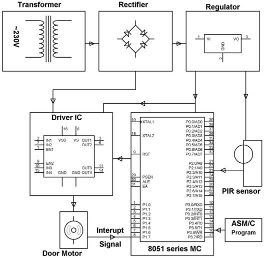 如果門附近有人體運(yùn)動,則人體發(fā)出的紅外輻射將使傳感器產(chǎn)生感應(yīng)信號,該信號被饋送到微控制器。然后,微控制器通過驅(qū)動器IC控制和操作門電機(jī)。因此,如果有人靠近門,則微控制器將發(fā)送一個(gè)命令以打開門,并設(shè)置一個(gè)延時(shí)時(shí)間以自動關(guān)閉門。該項(xiàng)目旨在用于購物商場,劇院和酒店的門。