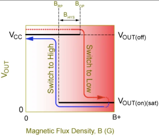 呈現(xiàn)出足夠強度(磁通密度)的正磁場(南極)的磁體將導致設備切換到導通狀態(tài)。一旦打開,單極IC將保持導通狀態(tài),直到磁場消失并且IC恢復為截止狀態(tài)為止。