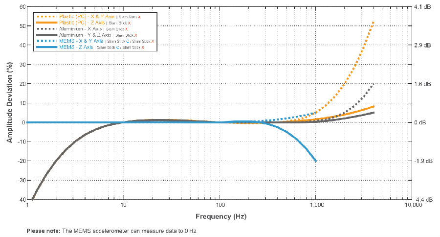 通常將帶寬指定為相對于參考頻率靈敏度(通常為100 Hz)的公差帶?梢砸园俜直群/或dB為單位指定公差帶,典型的頻段為±5%,± 10%,  ±1 dB甚至±3 dB。大多數(shù)數(shù)據(jù)手冊都會提供典型的頻率響應(yīng)曲線,以為用戶提供幫助。下面以enDAQ傳感器(以前為Slam Stick)的頻率響應(yīng)為例(摘自數(shù)據(jù)表);它也方便地將分貝與百分比偏差進行比較。