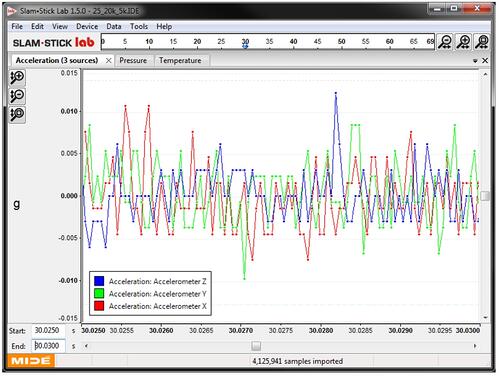 加速度計-寬帶噪聲噪聲級別可以通過多種不同方式定義。一些加速度計會將殘余噪聲定義為寬帶RMS值,通常以μV或μg為單位  。這是通過在沒有任何機械激勵的情況下取信號的均方根來計算的。低于寬帶噪聲水平的加速度將無法解決。 當(dāng)使用5 kHz低通濾波器以20 kHz采樣時,我在enDAQ傳感器的±25g寬帶噪聲的右邊添加了一張圖像  。該數(shù)據(jù)表  指定了一個噪聲電平小于0.01克RMS; 您會發(fā)現(xiàn)噪聲水平通常在  ±0.01g范圍內(nèi)。