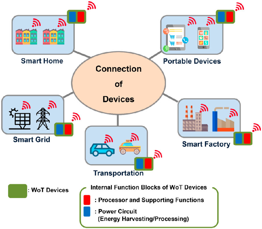 采用先進(jìn)的功率處理電路的技術(shù)已用于許多應(yīng)用的持續(xù)增長,例如無線傳感器網(wǎng)絡(luò),的IoT裝置,和家用電器。為了實(shí)現(xiàn)真正的物聯(lián)網(wǎng)(WoT)環(huán)境,需要用于各種連接設(shè)備的可靠電源電路。如圖1所示,此類設(shè)備內(nèi)部的電源電路執(zhí)行能量收集和功率處理,以使這些設(shè)備可操作并連接至WoT。此類WoT設(shè)備的處理器和發(fā)射器可以利用電源電路收集和處理的能量成功運(yùn)行。由于電源電路和不同類型的電源都在WOT裝置,它們的設(shè)計(jì)工程師不應(yīng)忽視的功率電路(例如,能量采集接口)對系統(tǒng)性能的因素的影響,如可靠性,成本和效率。本文考慮的用于WoT應(yīng)用的電源示例包括電池和太陽能電池。為了使不同電源有效且高效地運(yùn)行,系統(tǒng)設(shè)計(jì)人員應(yīng)考慮WoT設(shè)備中使用的電源電路的可靠電路控制策略和電源管理算法。