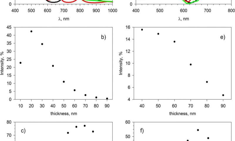 a)一維PC和PPC的透射光譜。虛線是PC的頻譜。粗線是具有30 nm Au層的PC的光譜。紅線是具有30 nm Au和270 nm緩沖層的PC的光譜。細線是30納米金層的透射光譜。b)對于Au層厚度的不同值,一維PPC的透射峰的強度。d)3D PC和PPC的透射光譜。虛線是PC的頻譜。粗線是具有40nm Au層(p極化)的PC的光譜。紅線是具有40nm Au和280nm緩沖層的PC的光譜。細線是具有40 nm Au層(s極化)的PC的光譜。e)繪制的3D PPC傳輸峰強度與金層厚度的關系 圖圖片來源:喀山聯邦大學