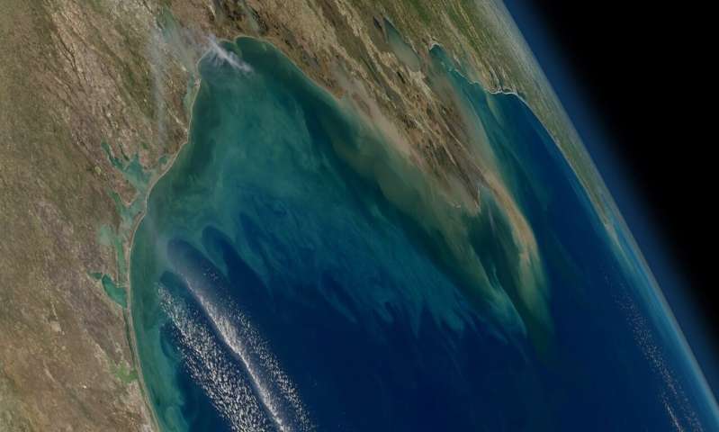 NASA的地球同步沿海成像和監(jiān)測輻射儀(GLIMR)儀器將收集墨西哥北部海灣地區(qū)沿海生態(tài)系統(tǒng)的高分辨率觀測結果,如這張圖片所示,其浮游植物水華從路易斯安那州海岸(左)橫跨密西西比河三角洲延伸(中)朝佛羅里達(最右邊)。圖片來源:NASA