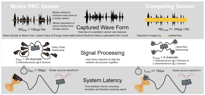 EV的優(yōu)點(diǎn)之一是靜音推進(jìn),但從設(shè)計(jì)和用戶角度出發(fā),權(quán)衡是道路噪音問題。Molex表示,其新傳感器與ADI網(wǎng)絡(luò)技術(shù)一起可通過縮短聲波消除時間并減輕布線重量來幫助改善RNC。