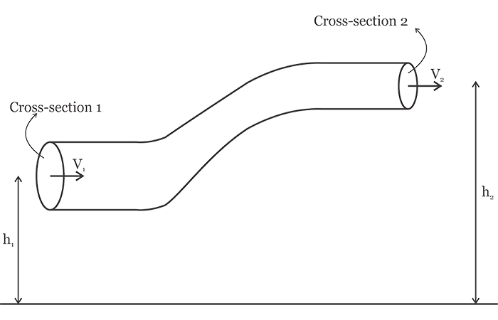 在上圖中,h 1和h 2分別表示在橫截面1和2處地球表面上方的流體高度。在管道直徑遠小于管道高度的情況下,我們可以假定給定橫截面中的所有流體粒子幾乎都處于相同的高度。將能量守恒定律應用于橫截面1和2的流體粒子,我們可以得出以下方程式: