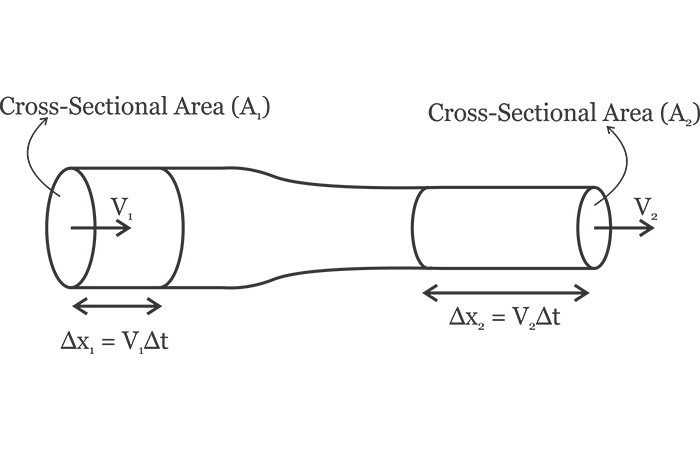 行進的距離可以用速度表示為Δx1=V1Δt。也就是說,在以下時間間隔內(nèi)進入管道的流體量Δt 是 A1V1Δt。將該值乘以流體密度可得出進入管道的質(zhì)量,如下所示:ρA1V1Δt。同樣,我們可以計算從管道右端出來的質(zhì)量,如下所示:ρA2V2Δt。