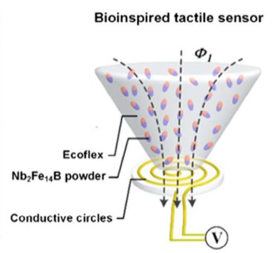 本研究的研究人員設(shè)計(jì)了一種新型的輕觸傳感器,該傳感器模仿了在我們皮膚中發(fā)現(xiàn)的默克爾圓盤的功能和結(jié)構(gòu)-對(duì)輕觸產(chǎn)生反應(yīng)的神經(jīng)末梢。新的觸覺(jué)傳感器利用了磁電效應(yīng),它由兩個(gè)不同的部分組成:第一個(gè)是復(fù)合混合物,由磁粉和彈性體組成,形成一個(gè)彈性磁塊,實(shí)際上它對(duì)默克爾圓盤的反應(yīng)相似。傳感器的后半部分由導(dǎo)電的盤繞銅線組成(見(jiàn)圖)。