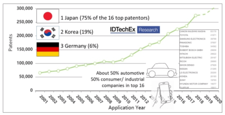 實際上,傳感器技術(shù)的創(chuàng)新正在發(fā)展。市場分析師估計,已針對汽車雷達,LiDAR,生物傳感器以及印刷和柔性傳感器等領(lǐng)域的應(yīng)用授予了80多項新專利。日本名列前茅,占16個頂級專利接受國的四分之三。三星電子是前五名中唯一的非日本公司,依次為佳能,豐田,松下和東芝。