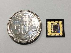 一種基于認知傳感技術(shù)的傳感器節(jié)點處理器的測試芯片。在芯片旁邊放置了一個50美分的硬幣,用于尺寸比較。圖片來源:A * STAR微電子研究所