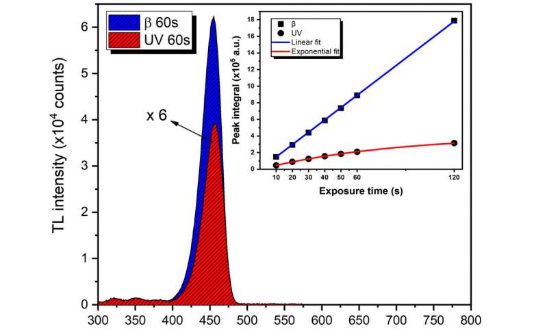 第二個是兩個響應(yīng)會根據(jù)不同的模式而變化,從而可以在未來的設(shè)備中解決紫外線干擾問題。該材料以線性方式響應(yīng)β射線:隨著其對電離輻射的暴露增加,其發(fā)光強(qiáng)度以連續(xù)曲線遞增。在紫外線輻射的情況下,材料的發(fā)光度不會線性變化。Trindade說:“有一個飽和點(diǎn),在這個飽和點(diǎn)之后,即使繼續(xù)暴露,發(fā)光也會停止增強(qiáng)!