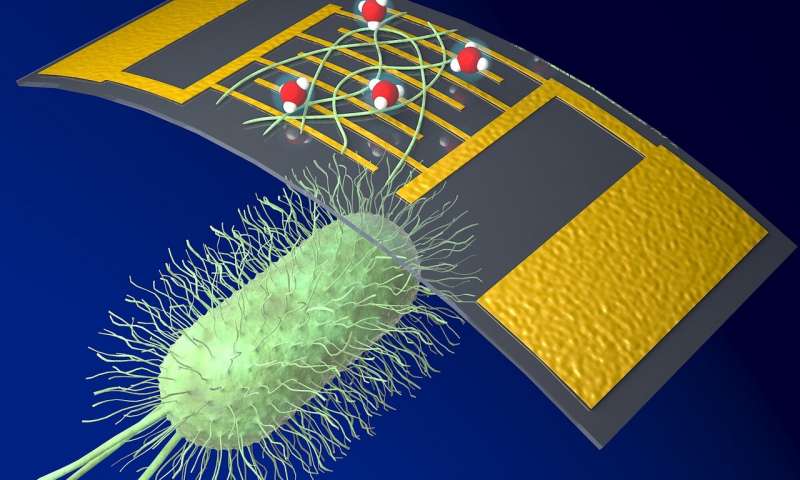 該傳感器使用源自細菌Geobacter 的導(dǎo)電蛋白納米線為電子設(shè)備提供生物材料。30多年前,資深作家和微生物學(xué)家德里克·洛夫利(Derek Lovley)在河泥中發(fā)現(xiàn)了Geobacter。微生物會長出像頭發(fā)一樣的蛋白質(zhì)細絲,充當(dāng)納米級“金屬絲”,以轉(zhuǎn)移電荷來滋養(yǎng)它們并與其他細菌交流。