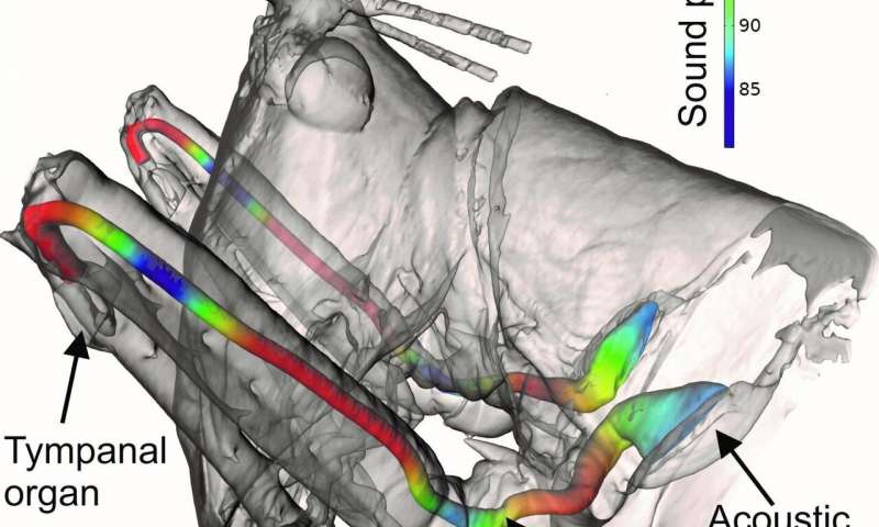 一個由感官生物學(xué)家和數(shù)學(xué)家組成的國際團隊發(fā)現(xiàn),昆蟲的喇叭形外耳(稱為氣管導(dǎo)管)通過放大和轉(zhuǎn)換壓力波來捕獲與哺乳動物耳道相同的聲音,然后將其傳遞給鼓膜表面為動物提供定向聽覺。
