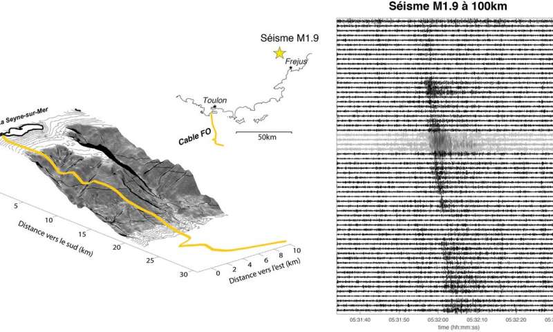 位于弗雷瑞斯(瓦爾)以北的1.9級地震產(chǎn)生的地震波記錄在沿土倫附近海底部署的41公里長的光纜上。在右側(cè)的記錄中,每條線對應(yīng)一個沿著電纜的測量點,從海岸(頂部)到大海(底部)。(41公里的電纜相當(dāng)于6000多個傳感器)。各個測量點處的波到達(dá)時間之差用于確定地震的位置。