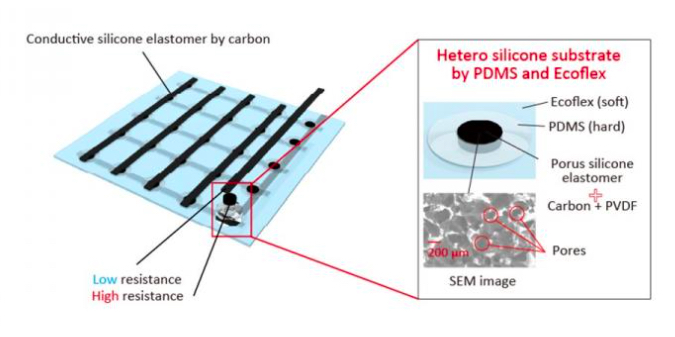 有機(jī)硅基材由兩種不同類型的有機(jī)硅制成-一種硬而一種軟。較硬的有機(jī)硅(PDMS)可以抑制壓力感應(yīng)元件在應(yīng)變下的變形。圖片由橫濱國立大學(xué)大田裕樹提供