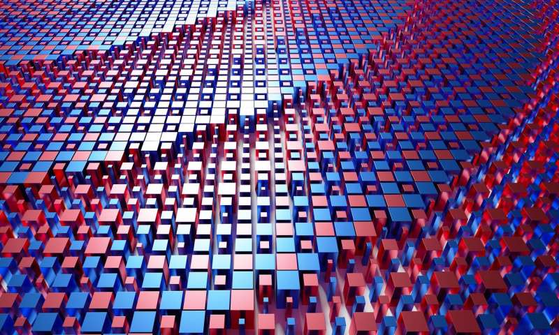 為緊湊的深度感應(yīng)設(shè)計(jì)的金屬元件的插圖。它由亞波長間隔的方形納米柱組成。通過交替顯示兩種不同的納米柱圖案(在此以紅色和藍(lán)色顯示),該金屬元素同時(shí)形成了兩個(gè)圖像。這兩個(gè)圖像模仿了跳躍蜘蛛眼中分層視網(wǎng)膜捕獲的圖像。圖片來源:郭琦和石柱君/哈佛大學(xué)