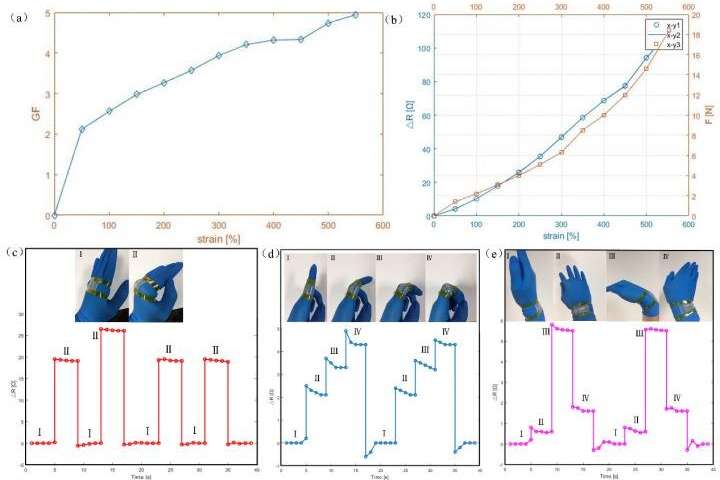 a)GF與菌株之間的關(guān)系。(b)電阻變化與應(yīng)變的關(guān)系。此傳感器的照片附在關(guān)節(jié)(c)/手指(d)/扭力(e)上,且動(dòng)作不同,并且相應(yīng)的電阻發(fā)生了變化。