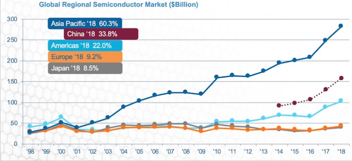 折線圖顯示了全球區(qū)域半導(dǎo)體市場(chǎng)的趨勢(shì)。在這里,您可以看到美國(guó)的領(lǐng)先地位是在2000年。圖片由SIA提供