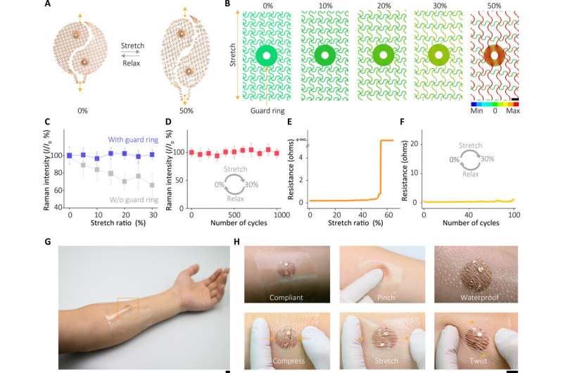 設備的機械特性。(A)傳感器變形時的光學圖像。(B)在各種變形下對可拉伸電極的保護環(huán)區(qū)域的FEM應變分布分析,表明該保護環(huán)可以將較大的變形隔離到軟彈性體中,從而避免了對SERS傳感組件產(chǎn)生潛在的破壞性塑性應變。(C)傳感器在各種變形下的SERS響應。(D)循環(huán)拉伸試驗后SERS傳感器的特性。(E)電極在各種變形下的電阻變化。(F)循環(huán)拉伸試驗后電極中的電阻變化。(G)在人體皮膚上安裝的傳感器的照片,以及(H)在各種條件下的照片。圖片來源:浙江大學劉向江。比例尺為1毫米(B)和1厘米(G和H)。誤差線定義為±SD。圖片來源:Science Advances,doi:10.1126 / sciadv.abe4553