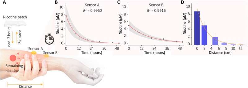人體皮膚中尼古丁代謝過程的體內(nèi)監(jiān)測。(A)實驗的示意圖。將包含?10 mg的尼古丁貼劑貼在志愿者的前臂上2小時,然后將其取出。徹底清潔皮膚后,我們的傳感器會提取并分析皮膚中殘留的尼古丁。(B和C)從兩個位置(傳感器A直接位于修補區(qū)域;傳感器B連接約2厘米)測量了剩余尼古丁濃度的變化。在出汗20分鐘(0.5 mA離子電滲療法電流,10%乙酰膽堿氯化物負載的水凝膠)抽出20分鐘后進行每次測量,并連續(xù)收集接下來10分鐘的傳感器響應。圖中顯示了獲得的平均尼古丁水平。陰影區(qū)域表示測量值的±SD。(D)貼劑后抽出的汗液中尼古丁濃度的距離依賴性。六個傳感器沿著手臂放置在距修補區(qū)域0到12.5 cm的距離處。圖片來源:Science Advances,doi:10.1126 / sciadv.abe4553