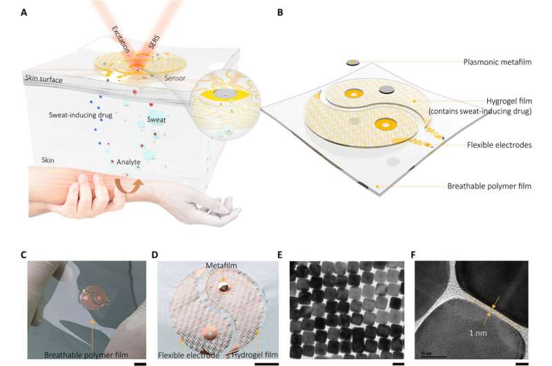 等離子體等離子材料集成的可穿戴SERS傳感設備。(A)顯示該設備工作原理和設計的示意圖;(B)由兩個主要組件(排汗組件和SERS感應組件)組成,其樣式看起來像是陰陽符號。插圖突出顯示了干膠片附近的按鍵感應界面。(C)該設備的光學圖像,(D)出汗組件的放大光學圖像。在螺旋形的分形網(wǎng)狀電極上安裝了一層薄薄的水凝膠層,上面裝有刺激汗腺分泌的分子(乙酰膽堿氯化物)。請注意,為了突出顯示的對比度,只有一個電極安裝了水凝膠層和等離激元超膜。圖片來源:浙江大學王英利。(E和F)安裝在電極中央的SERS傳感組件的高分辨率透射電子顯微鏡(TEM)圖像,該組件是由有序的銀納米立方體(NC)超晶格形成的等離子超薄膜。1 cm(C),5 mm(D),50 nm(E)和5 nm(F)的比例尺。圖片來源:Science Advances,doi:10.1126 / sciadv.abe4553