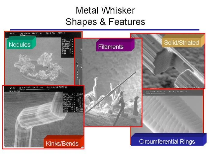 金屬或錫晶須的不同形狀和特征的圖像。圖片由NASA提供