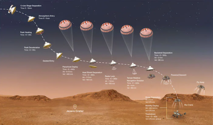 對進入,下降和降落(EDL)系統(tǒng)如何將火星車安全降落在火星表面上的功能進行了高級描述。圖片由NASA / JPL-Caltech提供