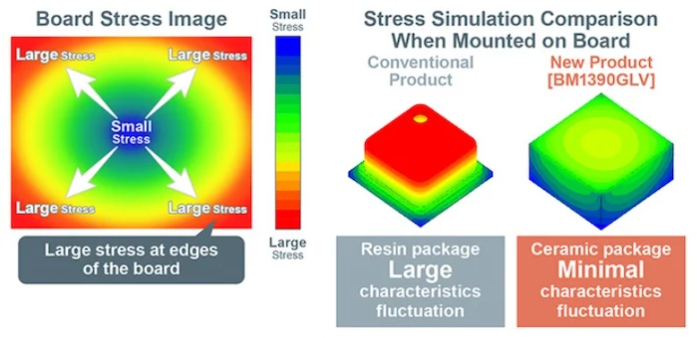 BM1390GLV 使用陶瓷封裝,最大限度地減少了安裝應力的誤差。下圖顯示了用于新傳感器的陶瓷封裝和傳統(tǒng)傳感器中常用的樹脂封裝的應力模擬。