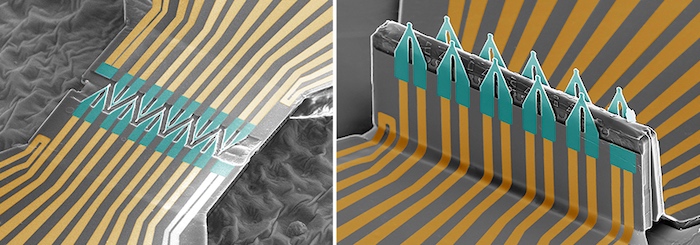 根據(jù)他們在Nature Nanotechnology上發(fā)表的文章,該團隊首先將 FET 制造成 2D 形狀,將形狀的特定點粘合到預拉伸的彈性體片材上,然后松開片材,從而構(gòu)建了 3D FET 陣列。這個過程導致了一個彎曲的器件,并導致 FET 折疊成一個 3D 陣列結(jié)構(gòu),可以很容易地穿透細胞。