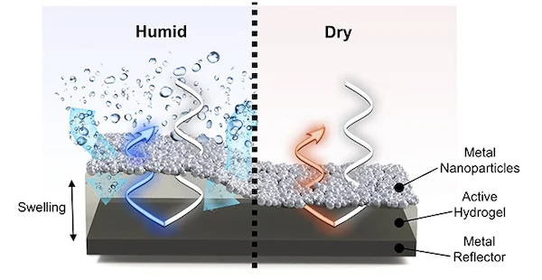 金屬納米粒子水凝膠-鏡面標(biāo)準(zhǔn)具在潮濕和干燥狀態(tài)下的特寫視圖。圖片由POSTECH提供