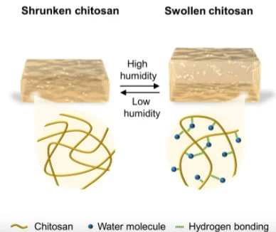 POSTECH 研究人員聲稱,這種殼聚糖(一種可生物降解的聚合物)水凝膠薄膜可以像超級(jí)海綿一樣快速膨脹和收縮:它可以吸收其周圍近 1,000 重量百分比的干重的水分。這種高吸水性質(zhì)量來自水分子和殼聚糖聚合物之間的氫鍵。
