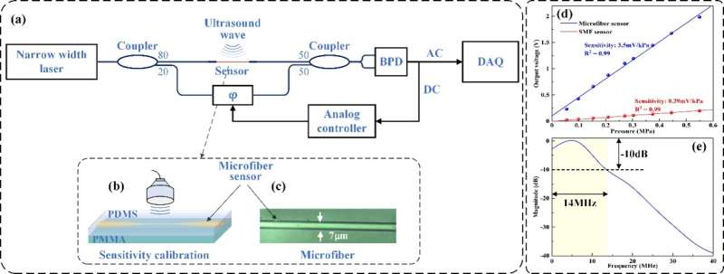 鑒于較大的倏逝場,研究人員將超細(xì)纖維的直徑優(yōu)化為 7μm。如圖1b所示,通過使用具有高彈性光學(xué)系數(shù)的聚二甲基硅氧烷(PDMS)材料來封裝微纖維,進一步提高了傳感器的靈敏度。當(dāng)超聲波作用在傳感器上時,由于彈性光學(xué)效應(yīng),PDMS的折射率會發(fā)生相應(yīng)的變化,從而導(dǎo)致微纖維的有效折射率發(fā)生調(diào)制。構(gòu)建了一個馬赫-曾德爾干涉儀來解調(diào)由入射超聲波引起的詢問激光的相位變化. 基于比例積分微分(PID)方法的反饋穩(wěn)定器用于補償由噪聲引起的低頻波動。實驗結(jié)果表明,與標(biāo)準(zhǔn)單模光纖傳感器相比,線性超細(xì)纖維超聲傳感器的靈敏度提高了一個數(shù)量級。該傳感器具有 153Pa 的低噪聲等效壓力和高達(dá) 14MHz (-10dB) 的寬響應(yīng)帶寬。此外,該傳感器可用于微弱信號的檢測,通過優(yōu)化超細(xì)纖維和檢測系統(tǒng),提高傳感器的靈敏度和帶寬。