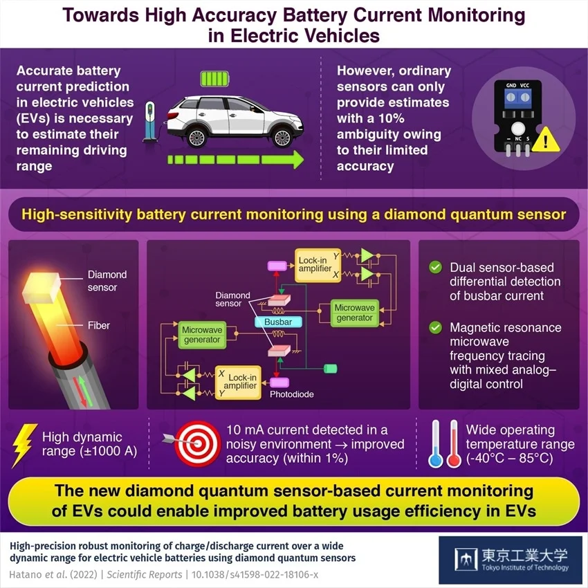 幸運(yùn)的是,由東京工業(yè)大學(xué)(Tokyo Tech)的 Mutsuko Hatano 教授領(lǐng)導(dǎo)的日本研究團(tuán)隊(duì)現(xiàn)在已經(jīng)提出了解決方案。在他們發(fā)表在《科學(xué)報(bào)告》上的研究中,該團(tuán)隊(duì)報(bào)告了一種基于金剛石量子傳感器的檢測(cè)技術(shù),該技術(shù)可以在測(cè)量電動(dòng)汽車典型的高電流時(shí)以 1% 的準(zhǔn)確度估計(jì)電池電量。