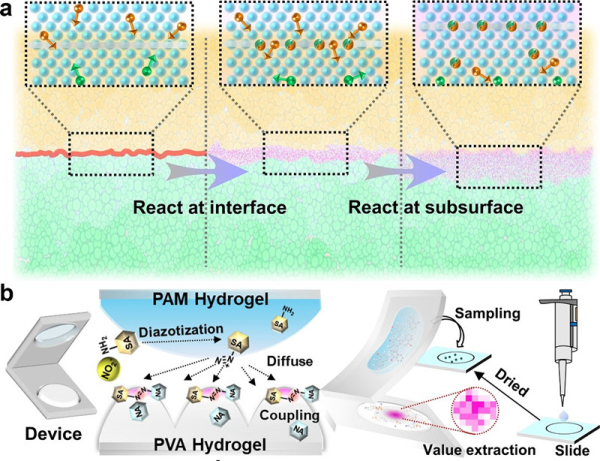 a、具有非對(duì)稱擴(kuò)散的水凝膠體系示意圖;b、用于亞硝酸鹽檢測(cè)的雙層水凝膠器件