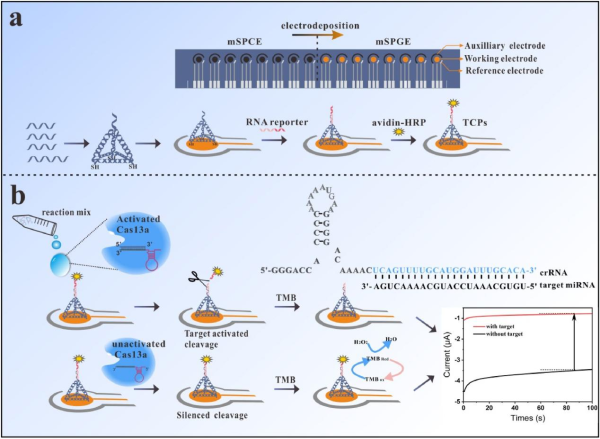 近日,中國科學院上海微系統(tǒng)與信息技術研究所研究員宓現(xiàn)強課題組構建了一種基于CRISPR的電化學傳感器(CRISPR-E)。該研究將DNA四面體框架結構修飾在印刷電極上,進一步與RNA探針雜交,最后連接HRP分子構建TCP探針;通過將電化學技術、DNA四面體框架結構與CRISPR技術相結合,利用Cas 13a在crRNA的引導下識別靶RNA后能夠?qū)捂淩NA表現(xiàn)出“附帶切割”能力,實現(xiàn)了對miRNA的無擴增、高靈敏度檢測。由于整個反應過程可以在電極上實現(xiàn),因此有望推動miRNA的及時快速(POC)檢測。