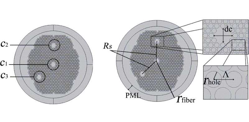 研究人員設(shè)計(jì)的用于測(cè)量脊柱曲率的三芯光纖傳感器。三個(gè)光纖芯的位置在所提出的傳感器中產(chǎn)生了不對(duì)稱的幾何形狀,使其能夠測(cè)量脊柱曲率的方向和大小。來(lái)源:光學(xué)工程(2022 年)。DOI:10.1117/1.OE.61.9.097102