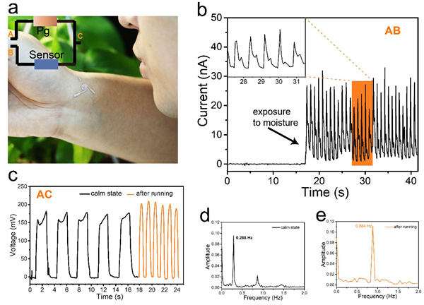 圖4. a.自供能傳感系統(tǒng)貼附于腕部的光學(xué)照片。b.自供能傳感系統(tǒng)的實(shí)時(shí)電流信號(hào),濕度由人吹氣提供,測(cè)試連接AB端。c.自供能傳感系統(tǒng)監(jiān)測(cè)呼吸。d-e.c圖中時(shí)間-電流曲線(xiàn)的傅里葉變換信號(hào)。