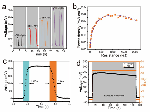 圖3. a. g-PDA柔性自供能器件在ΔRH分別為30%, 50%, 70%,和 90%時(shí)產(chǎn)生的開(kāi)路電壓信號(hào)。b. g-PDA自供能器件在不同外接電阻下的有效輸出功率(ΔRH=90%)。c. g-PDA自供能器件對(duì)濕氣的響應(yīng)和恢復(fù)時(shí)間(ΔRH=50%)。d. g-PDA自供能器件在恒定ΔRH=50%條件下的開(kāi)路電壓信號(hào)。