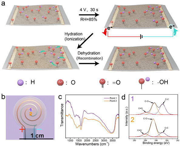 圖2. a. 高濕度環(huán)境下極化處理PDA示意圖。b. 極化后的g-PDA柔性自供能器件示意圖。1電極為施加極化電壓的陽(yáng)極,2電極為陰極。c.靠近1和2電極區(qū)域的PDA薄膜紅外譜圖。d. 靠近1和2電極區(qū)域的PDA薄膜表面C元素高分辨XPS譜圖。