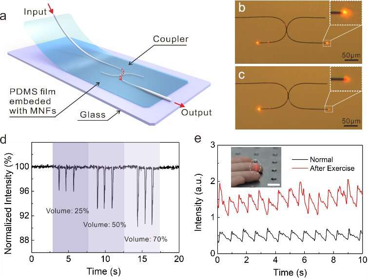 基于MNF耦合器的應變傳感器工作原理 (a) 應變傳感器結(jié)構(gòu)示意圖。(b), (c) MNF 耦合器在間隙略微變化之前和之后的光學顯微照片,分別。MNF的直徑約為900nm,彎曲半徑為50μm。(d) 設(shè)備對三種不同音量的節(jié)拍器的響應。(e) 在正常情況下(每分鐘 72 次)和運動后(每分鐘 85 次)測量實時指尖脈搏波。插圖顯示了傳感器連接到指尖以測試指尖脈搏的照片,比例尺為 1 厘米。圖片來源:Compuscript Ltd