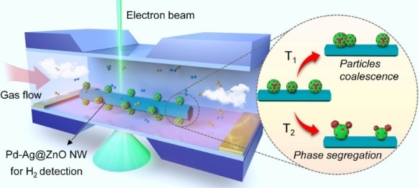 該研究使用氣相原位TEM實驗,在工況條件下觀測到Pd-Ag合金納米顆粒催化劑的形貌和物相演變?nèi)^程,揭示了該合金納米催化劑在不同工作溫度下的失活機制,并據(jù)此對MEMS氫氣傳感器進行優(yōu)化,有效推進了氫氣傳感器的實用化。原位TEM實驗結(jié)果表明(圖3),當半導體氫氣傳感器在300 ℃工作時,相鄰近的Pd-Ag合金納米顆粒易發(fā)生融合、顆粒長大現(xiàn)象,且顆粒的結(jié)晶性提高。Pd-Ag合金納米顆粒催化劑的粒徑增大、缺陷減少,使其催化活性降低,引起氫氣傳感器的靈敏度出現(xiàn)衰減。當氫氣傳感器在更高溫度(500 ℃)下工作時,Pd-Ag合金納米顆粒進一步發(fā)生相偏析,Ag元素從合金相中析出,同時生成了PdO相,導致催化劑喪失了協(xié)同增強效應,使氫氣傳感器的靈敏度大幅下降甚至失效。