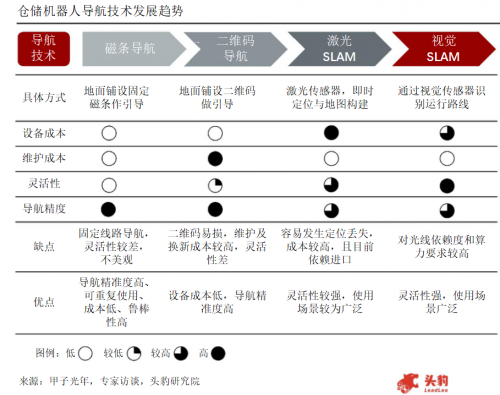 磁條導(dǎo)航與二維碼導(dǎo)航,具有維護(hù)成本高,路線固定導(dǎo)致靈活性相對(duì)較差的特點(diǎn)。視覺SLAM相對(duì)激光SLAM的技術(shù)成熟度較低,且對(duì)光線的依賴度較高,并且算法量大也是行業(yè)難點(diǎn)。
