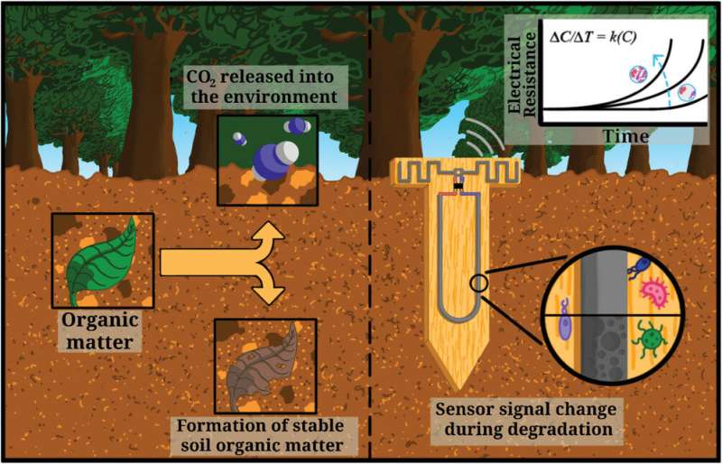 分解傳感器的概念,其中可生物降解的導電痕量的侵蝕速率與土壤中的微生物活動相關。