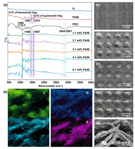 圖2.PEO/PANI/G 印刷傳感膜的 FTIR、EDS 和 SEM 結(jié)果