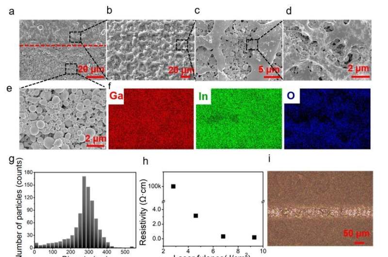 柔性濕度傳感器的表征。具有激光燒結(jié)和(a,e)的GWLM(a-d)的SEM圖像。(f) Ga、In和O分布的EDX圖像。(g) PI薄膜上未燒結(jié)的GWLM顆粒的直徑尺寸分布直方圖。(h) 不同激光通量下激光感應(yīng)導(dǎo)電GWLM路徑的電阻率。(i) 激光通量為9.4 J/cm2時(shí)燒結(jié)LM路徑的最小分辨率。(j)-(l) GA原理圖2O3基于/LM的濕度傳感器,具有各種制造參數(shù)(即電極的寬度和長(zhǎng)度,紫外激光通量)(頂部)。Ga的循環(huán)測(cè)量2O3基于 /LM 的濕度傳感器,通過(guò)周期性地將濕度從 30% RH 更改為 95% RH(底部)。學(xué)分:光電進(jìn)展(2023 年)。DOI: 10.29026/oea.2023.220172
