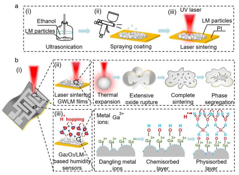 柔性電容式濕度傳感器的設(shè)計(jì)和制造。(a) 柔性GA的制造工藝2O3/LM濕度傳感器,包括超聲波,噴涂涂層和激光燒結(jié)。(b) 激光燒結(jié)形成GWLM薄膜的機(jī)理示意圖和Ga的傳感機(jī)理示意圖2O3/基于 LM 的濕度傳感器。學(xué)分:光電進(jìn)展(2023 年)。DOI:10.29026/oea.2023.220172