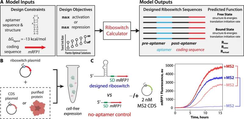 “過去設(shè)計(jì)這種核糖開關(guān)傳感器的努力在很大程度上依賴于試錯(cuò)實(shí)驗(yàn),例如,構(gòu)建和表征大型隨機(jī)文庫以識別有效的核糖開關(guān)變體 - 遺傳藍(lán)圖和適配體,”Salis說。“結(jié)合熱力學(xué)建模和計(jì)算優(yōu)化,我們合理地設(shè)計(jì)了新的核糖開關(guān),這些核糖開關(guān)被預(yù)測為良好的蛋白質(zhì)傳感器,然后我們對其進(jìn)行了測試。我們的設(shè)計(jì)算法稱為Riboswitch計(jì)算器。
